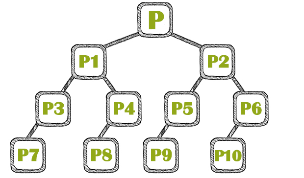 C'est la part P1 qui prend la relève à la part P... Et la part P1 n'est pas 0% mais déjà à 40%. Regardez bien le schéma ci-dessus. La part P1 dispose déjà de 4 parts sous elle (les parts P3, P4, P7 et P8).