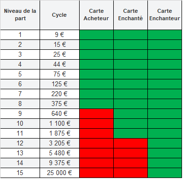 Fonction du statut choisi par vous, vos parts peuvent grimper sur différents niveaux. Ainsi un acheteur simple pourra grimper jusqu'au niveau 8; un acheteur enchanté jusqu'au niveau 11; un Enchanteur jusqu'au niveau 15.
